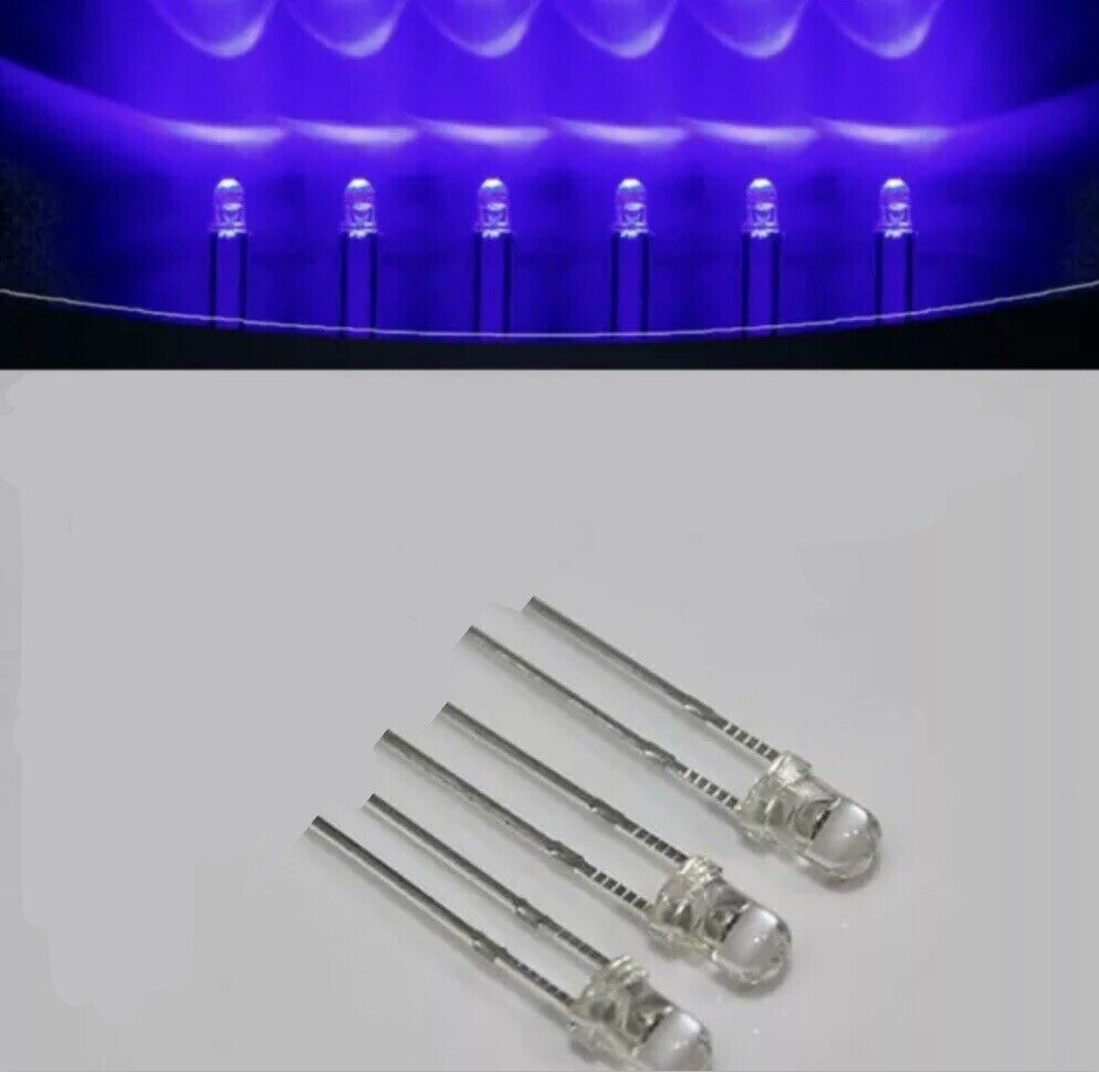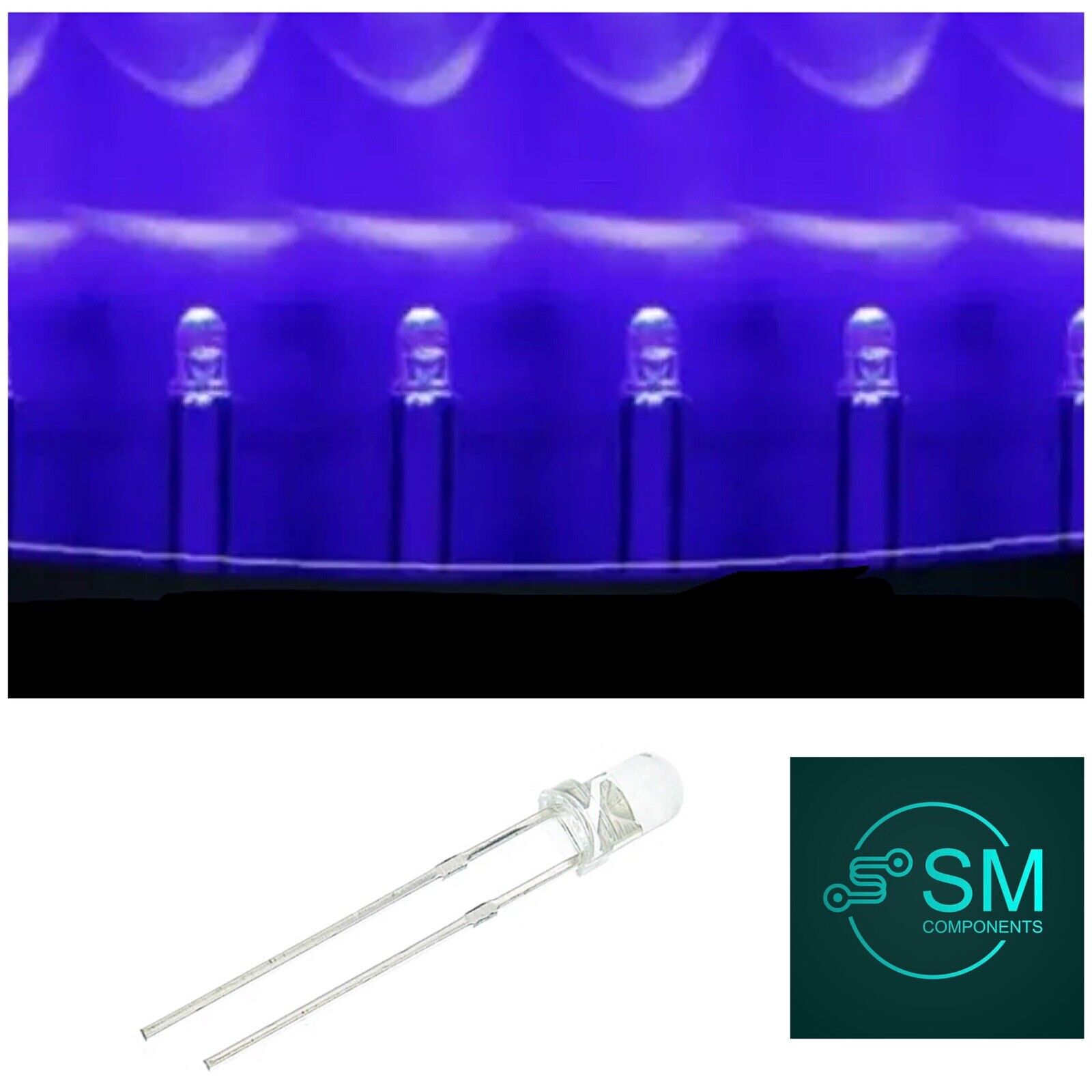 3mm Ultra Violet UV 390-400nm Led Diode Round Clear Head LED, Long lead length, 18-20mm leads 100pcs Condition is Brand New. Sent with Australia post in a antistatic bag, in a padded envelope. No tracking