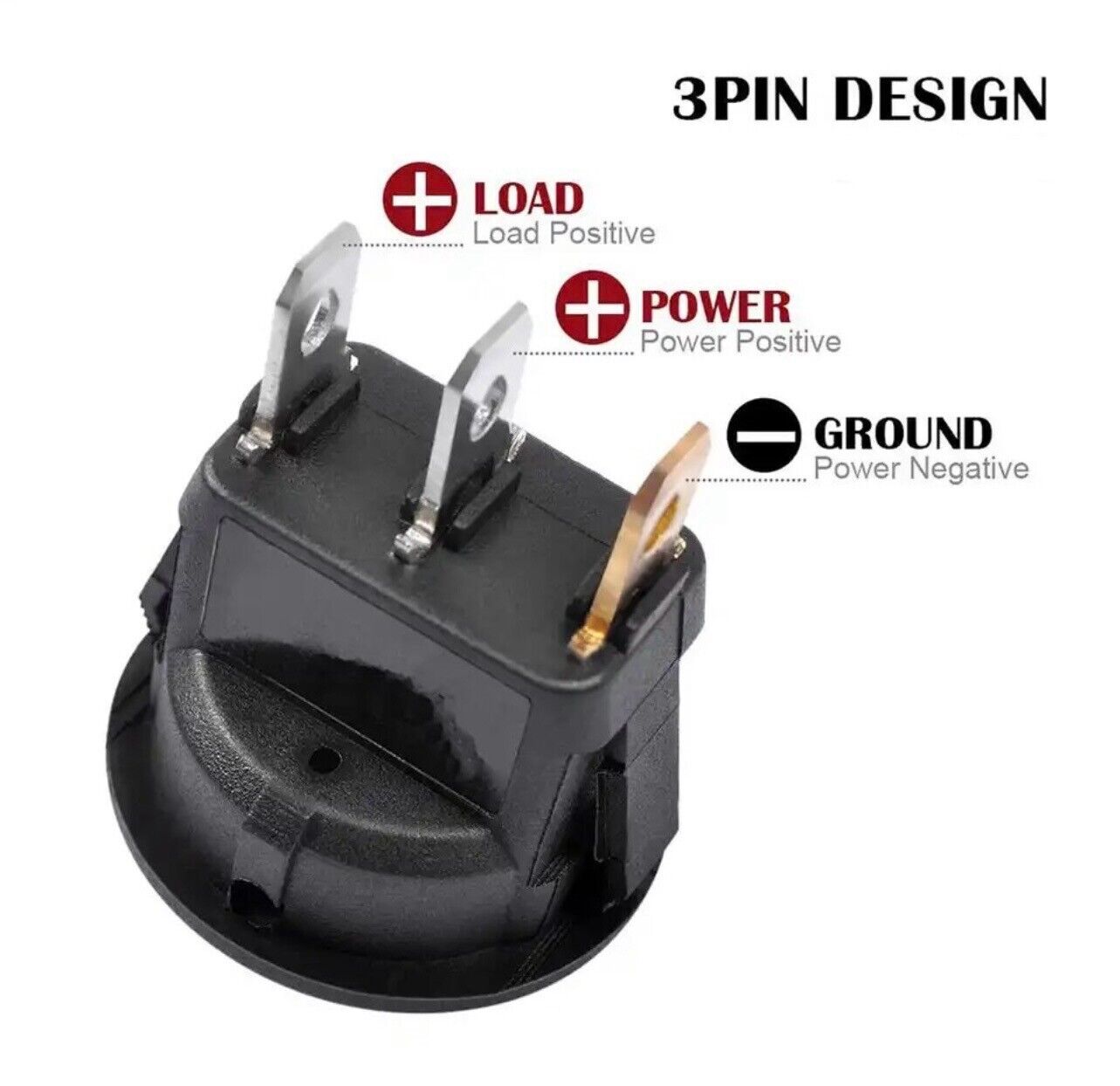 LED lamp will be lighted up when the switch is turned on. Fits into a 3/4" hole.And it comes with a keyhole slot to prevent unwanted rotation. Coppery pin is connected to the battery negative pole, the next pin is connected to the battery positive pole, the last one is connected to the equipment positive pole.